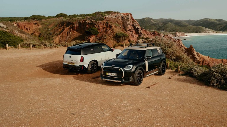MINI John Cooper Works Countryman ALL4: WLTP Energieverbrauch kombiniert: 8,2l/100km; WLTO CO2-Emissionen kombiniert: 186g/km; CO2-Klasse: G; MINI Countryman SE ALL4; WLTP Energieverbrauch kombiniert: 18,5 kWh/100km; WLTP CO2-Emissionen kombiniert: 0 g/km; CO2-Klasse: A; WLTP Elektrische Reichweite: 432 – 399 km, Fahrzeugabbildung zeigt Sonderausstattung. disclaimer