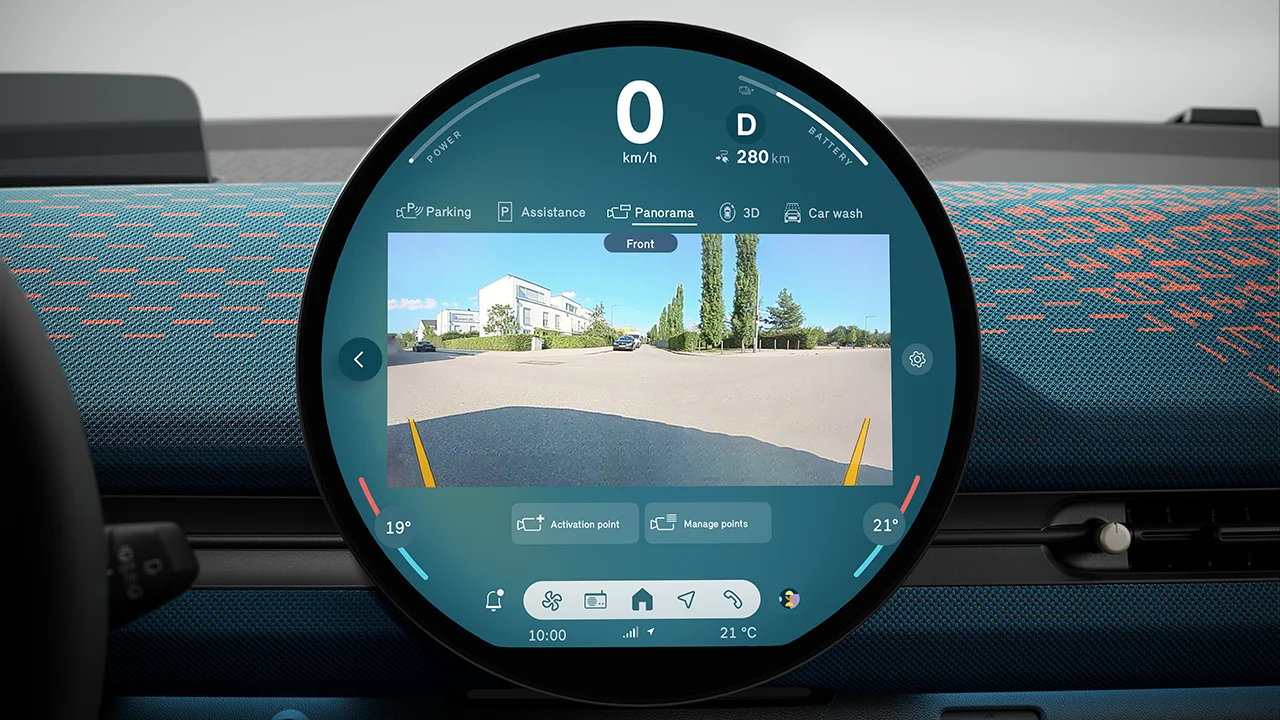 Das mittig angeordnete, markante 24 cm Display aus hochwertigem Glas dient als Kombiinstrument und steuert gleichzeitig die Infotainment- und Assistenzsysteme. Es ist außerdem das weltweit erste runde Display der Automobilbranche.