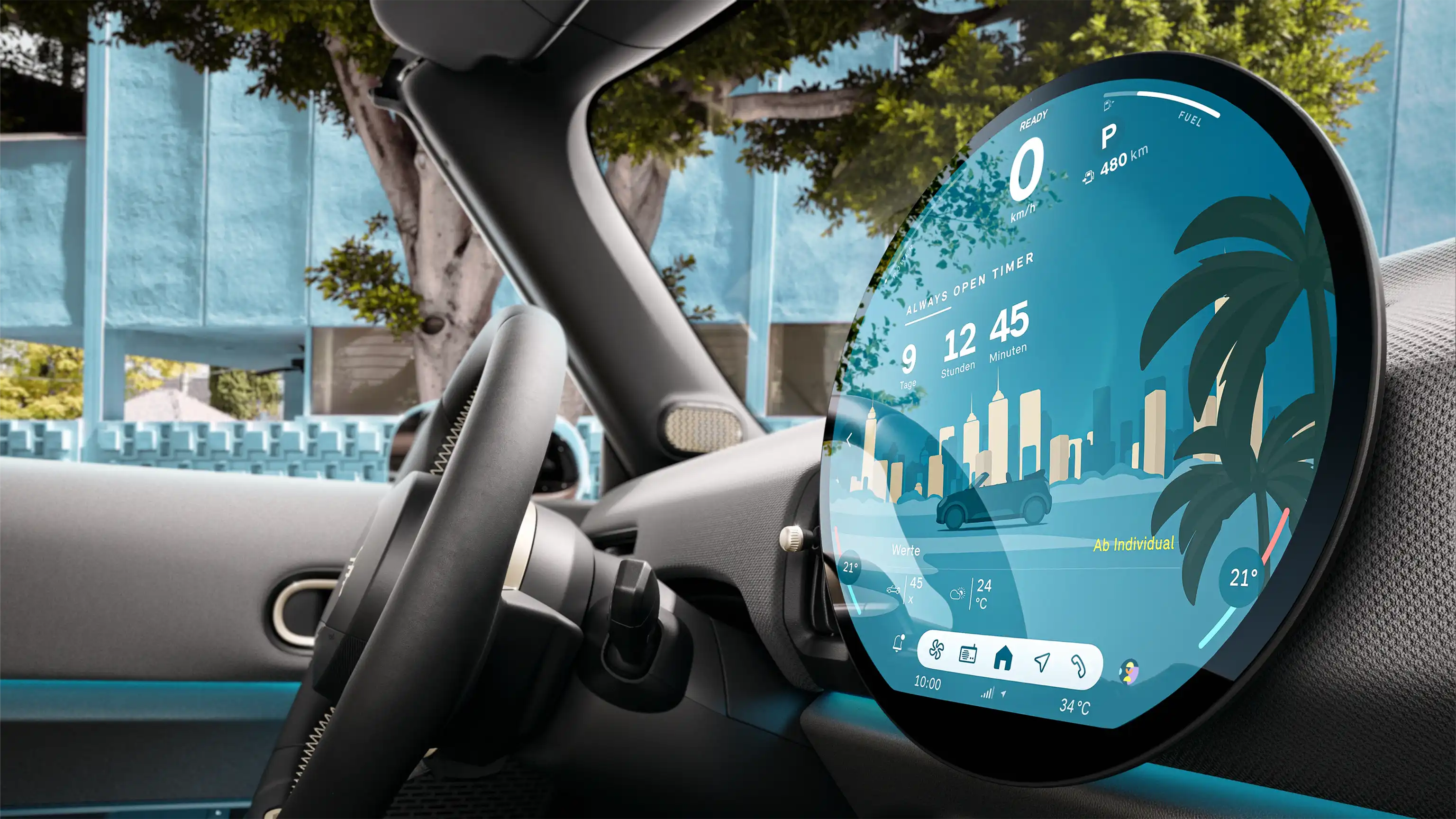Das mittig angeordnete, markante 24 cm Display aus hochwertigem Glas dient als Kombiinstrument und steuert gleichzeitig die Infotainment- und Assistenzsysteme. Es ist außerdem das weltweit erste runde Display der Automobilbranche.