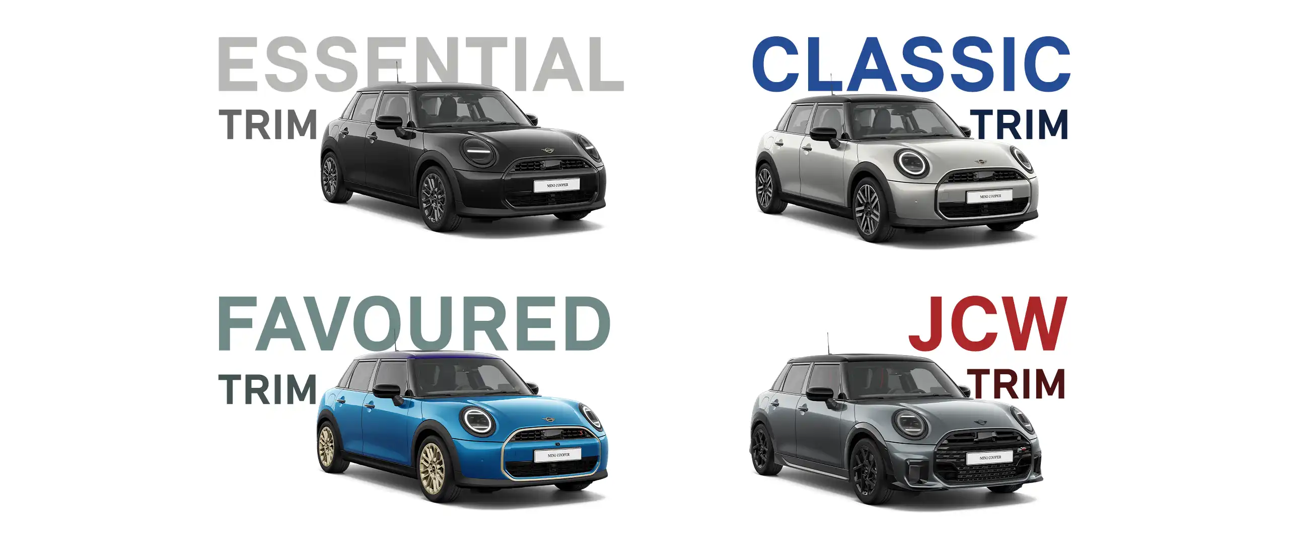 Ja, Sie können Ihren MINI Cooper 5-Türer mit einer großen Auswahl an Karosseriefarben nach Ihrem Geschmack gestalten. Für einen besonders außergewöhnlichen Look können Sie außerdem für das Dach einen unserer speziellen Multitone-Farbverläufe wählen. Damit Ihr MINI Cooper perfekt zu Ihrem persönlichen Lifestyle passt, stehen Ihnen darüber hinaus zahlreiche weitere Optionen zur Verfügung. Beispielsweise sind mit unseren Trims speziell abgestimmte optionale Ausstattungspakete erhältlich, mit denen Sie Ihrem MINI Cooper 5-Türer einen individuellen Charakter verleihen können. In der Grundausstattung enthalten ist der Essential Trim. Mit den Trimvarianten Essential, Classic, Favoured oder JCW können Sie Komfort, Sportlichkeit und Design Ihres MINI Cooper nach Ihren Wünschen individualisieren.