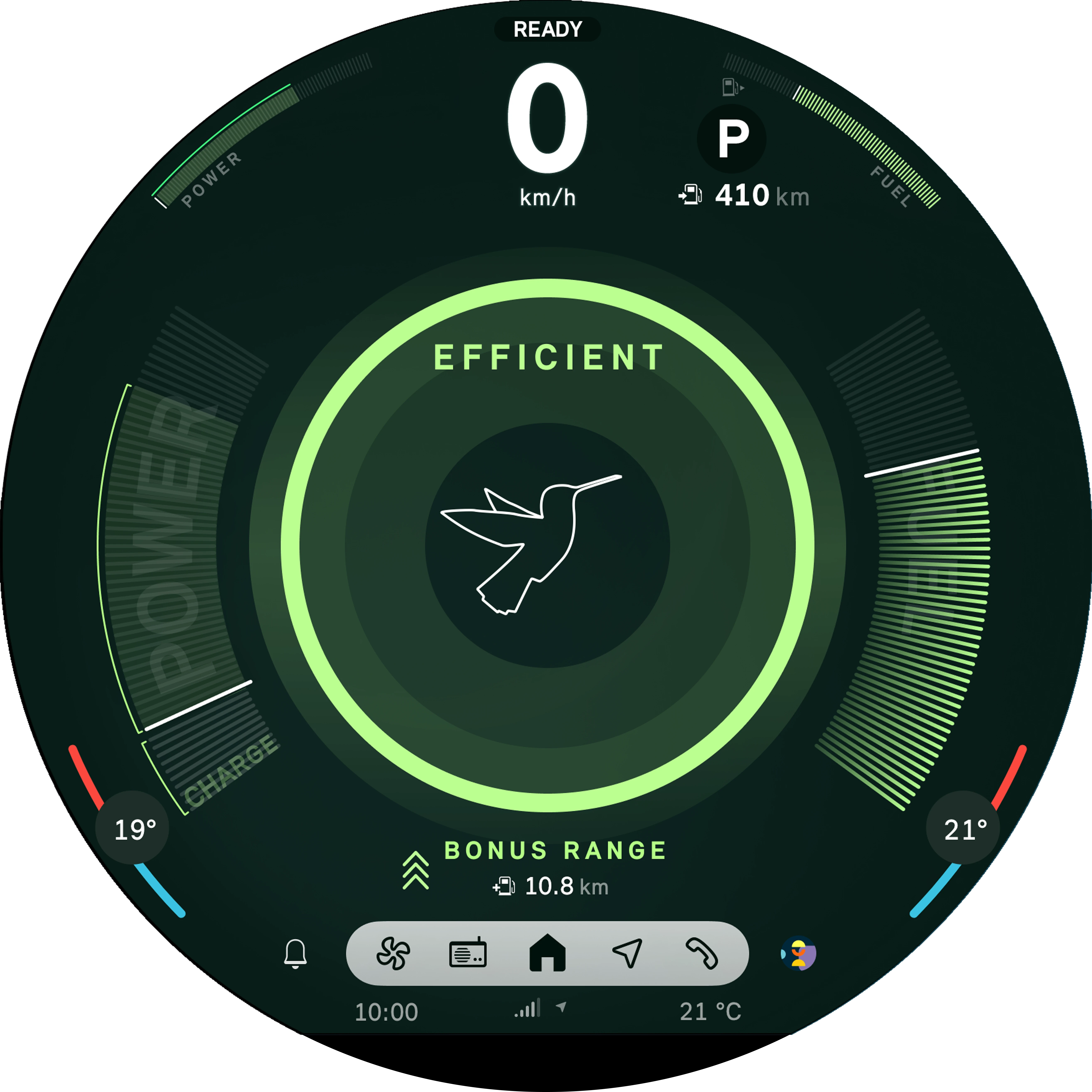 Der Efficient Mode unterstützt Sie dabei, Verbrauch und Emissionen zu senken. Dazu werden Komfortfunktionen wie die Leistung der Klimaanlage und die Motorsteuerung angepasst. In der Bildschirmanzeige wird die dadurch verlängerte Reichweite als Reichweitenbonus angezeigt.